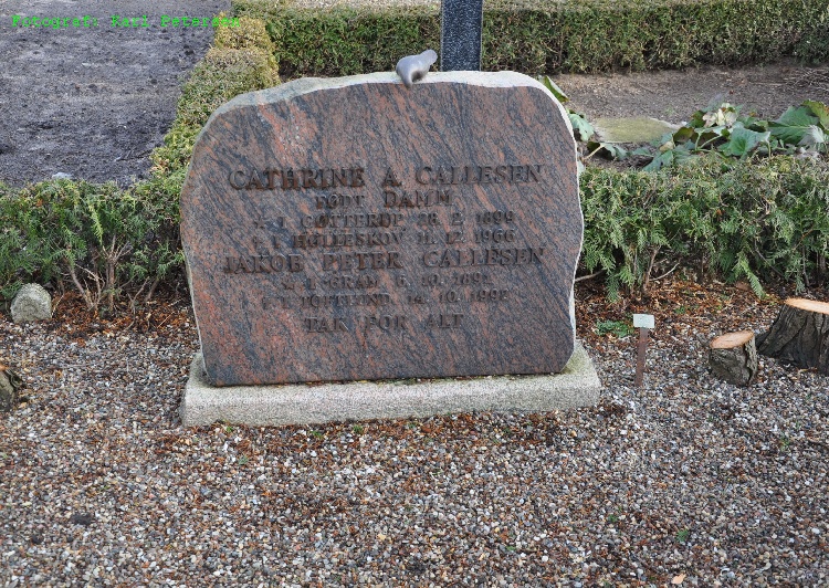 AO, KB-Tislund, opslag 64, side 226, nr. 2, Døde 1966, 11.december Hølleskov, Toftlund S., Begravet 1966, 14.december Tirslund kirkegård, Cathrine Abeline Callesen født Damm. Gift med forhenværende husmand i Hølleskov, Toftlund S., Født den 28.februar 1899 i Tirslund S., datter af husmand Andreas Iversen Damm og hustru Maren Henriette Riisbøl. Efterlevende ægtefælle Jakob Peter Callesen, sidste fælles bopæl: Hølleskov, Toftlund S. 67 år gl.