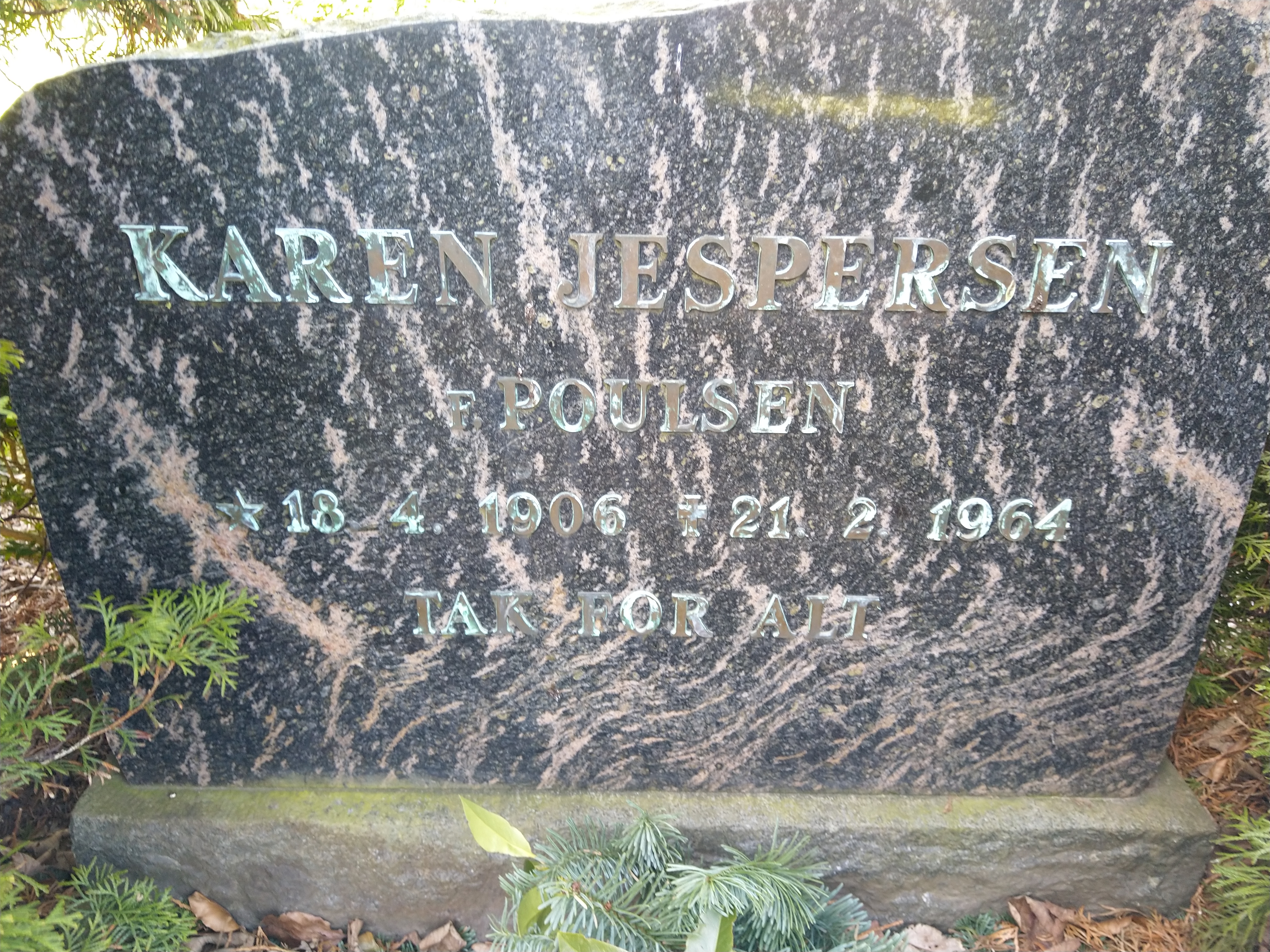 fra: https://www.dodsregister.dk/Infopage.aspx?id=wmJBrzfmJYE2dmxvpr1BM56eP/ZJRjPv Karen Jespersen f. Poulsen, f. 18-04-1906, d. 21-02-1964, 57 år, Djursland Lægekreds.
