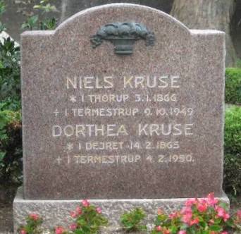 AO, KB-Hvilsager, opslag 234, side 280, nr. 3, Døde 1949, 9.oktober, Vidtskuegaard, Termestrup, Hvilsager S., Begravet 1949, 15.oktober, Hvilsager K., Niels Nielsen Kruse, Forhenværende gårdejer, rentier, Vidtskuegaard, Termestrup. Født i Tved, Sogn, Søn af gårdejer Niels Nielsen Kruse og hustru Else Marie Madsen, Thorup pr Knebel, begge døde. Gift med Dorthea Jeppesen, s.fælles bopæl: Vidtskuegaard, Termestrup. F.1866, 3.januar.